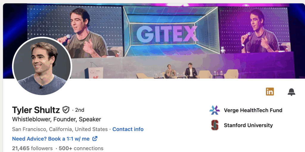 Tyler Shultz’s LinkedIn tag line is “Whistleblower, Founder, Speaker.” Talking about what he learned at Theranos has become part of his career. He identifies Theranos by name as his employer for the eight months he worked as a Research Engineer.