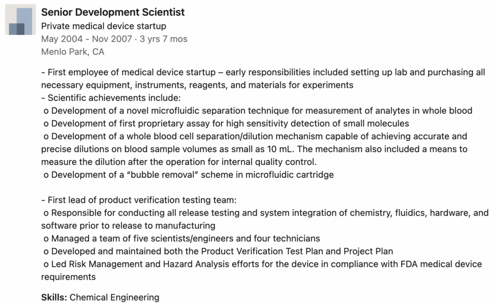 On one hand, I’m surprised that Young is showing his time at Theranos on his LinkedIn profile. Spending nine years there, even if he did zero wrong, is a bad look at his level of seniority, to put it mildly. With a pretty generic name, he would have been very difficult to find on LinkedIn if he hadn’t listed Theranos. He could have slipped into digital obscurity.